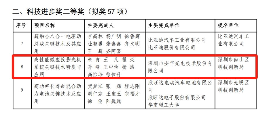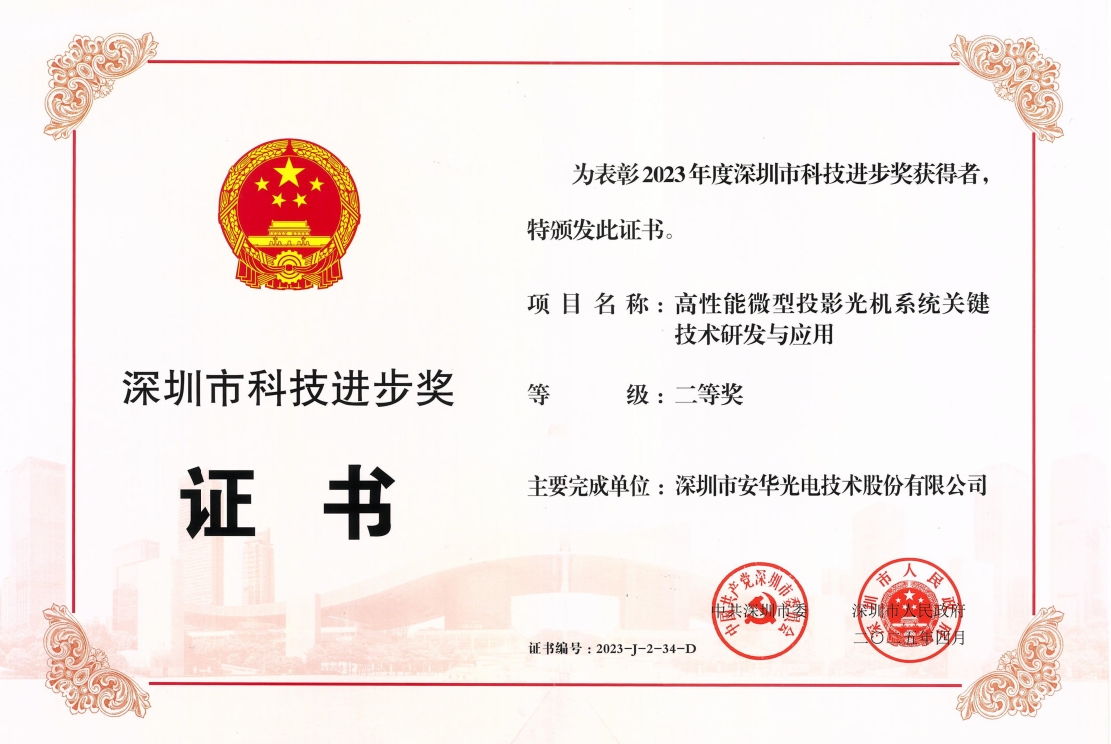 近日,深圳市人民政府正式頒發(fā)2023年度深圳市科技進(jìn)步獎(jiǎng)獲獎(jiǎng)證書,安華光電憑借在投影光機(jī)領(lǐng)域的創(chuàng)新研發(fā)成果,榮獲“深圳市科技進(jìn)步獎(jiǎng)二等獎(jiǎng)”。這一榮譽(yù)不僅是對(duì)安華光電技術(shù)實(shí)力的高度認(rèn)可,也彰顯了公司在投影領(lǐng)域的領(lǐng)先地位和持續(xù)創(chuàng)新能力。